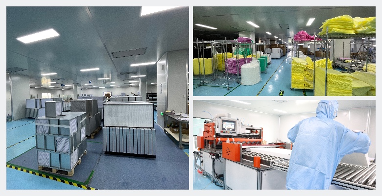 多台外框生产线、过滤材料生产线、多个组装车间